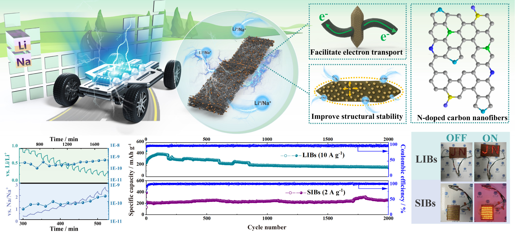 乔辉教授和魏取福教授团队在Advanced Fiber Materials上发表了题为“Growth-Controllable Spindle Chain Heterostructural Anodes Based on MIL-88A for Enhanced Lithium/Sodium Storage”的研究进展。研究者通过静电纺丝技术和种子介导生长策略,在水溶液中配位Fe3+和富马酸,构建了一种纺锤链结构金属有机框架(MIL-88A)自牺牲模板,这是一种环境友好的合成路径。研究结果表明,种子介导生长策略可以将成核和生长阶段相分离,从而更好地控制MIL-88A的形状演变,提升面质量负载量。得益于其杂原子掺杂导电网络、多孔结构和多组分协同效应,纺锤链结构Fe2O3@N掺杂碳纳米纤维(FO@NCNFs)应用于锂离子电池和钠离子电池显示出良好的倍率性能和长循环稳定性。