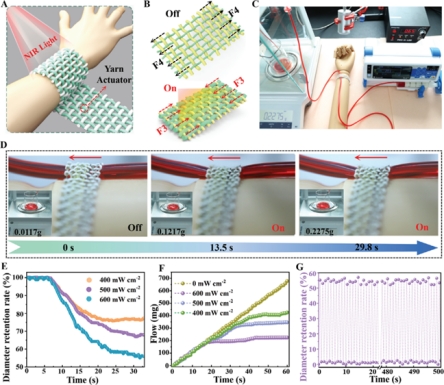 研究表明,可光聚合的AuNRs在LCE分子链内均匀交联,智能纱线表现出长期稳定的光吸收和光热超驱动性能。由于纱线具备仿生“类蜘蛛网”的层次结构特征,与目前LCE纤维驱动器相比,AuNRs@LCE智能纱线驱动器表现出超收缩驱动应变(≈81%)和稳定持久的变形特性。此外,研究开发的光驱动微型游泳器可以在水面上快速移动,智能止血绷带在光刺激下可以有效达到止血效果。