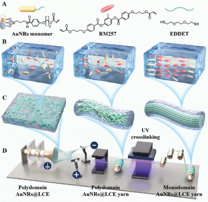 液晶弹性体(LCE)是一种典型的软驱动器智能刺激响应材料,是一种具有独特的双向形状记忆功能,具有聚合物橡胶熵弹性的光交联聚合物。其中,LCE纤维是LCE的一种常见形式,具有较大的形状变形,外部刺激下具有良好的可织性,在人工肌肉、智能纺织品和软机器人中具有不同的应用。然而,无机纳米材料掺杂LCE制备光驱动纤维致动器仍存在一些缺陷:如生产工艺复杂、驱动变形率有限、有机-无机界面结合稳定性较差等,限制了其进一步应用。