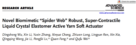 魏取福教授团队和安徽工程大学凤权教授团队联合新疆大学夏鑫教授团队利用静电纺丝和光交联策略,快速稳定的制备了具有跨尺度分级结构的金纳米棒复合LCE(AuNRs@LCE)智能纱线软体驱动器,该纱线致动器呈现出超收缩变形特性,作为概念验证,将其应用于人工肌肉、微型游泳器和智能止血绷带等方面。相关工作以“Novel Biomimetic “Spider Web” Robust, Super-Contractile Liquid Crystal Elastomer Active Yarn Soft Actuator”为题,发表于Advanced Science(DOI:10.1002/advs.202400557)期刊上,文章第一作者为91色情网