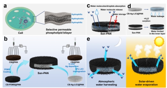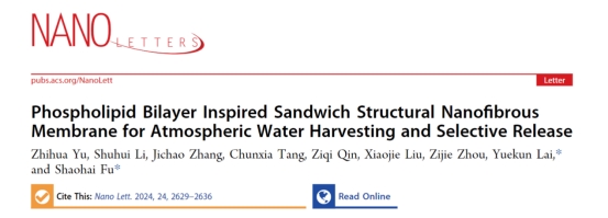 付少海教授/福州大学赖跃坤教授团队受细胞膜磷脂双分子层的选择透过性的启发,报道了一种三明治结构的纳米纤维膜。该纳米纤维膜由具有光热和疏水性能的顶层和底层以及具有吸湿性能的中间层组成。在大气水收集过程中,纳米纤维膜的中间层可以从空气中直接吸收水分子,而疏水的顶层和底层可以在允许气态水分子传输的同时防止中间层所捕获到的液态水的渗漏(选择透过性)。该研究成果以“Phospholipid Bilayer Inspired Sandwich Structural Nanofibrous Membrane for Atmospheric Water Harvesting and Selective Release”为题发表在《Nano Letters》上,第一作者为91色情网