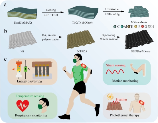 王潮霞教授和加拿大滑铁卢大学Yuning Li 教授提出了一种具有多功能传感能力和自供电潜力的MXene热电织物。这种以织物为基材的可穿戴热电器件,利用织物基材自身的柔韧性和透气性,成功解决了人体穿着舒适性问题。而基于MXene材料设计的热电织物在温度传感和应变传感方面都表现出色,是连续数据收集和监控的理想选择。这种将MXene材料和与纺织技术相结合的能力,推动可穿戴智能织物的发展,使智能织物离实用更进一步,展示了在能量收集、运动跟踪和健康监测方面具有广阔的应用前景。