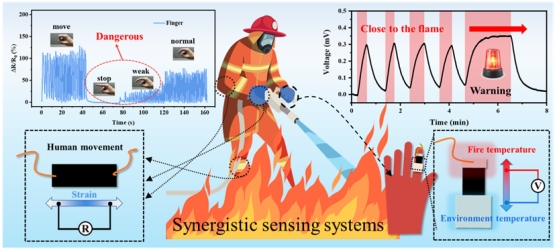 综上所述,与化学聚合中使用的催化剂氯化铁相比,酶促聚合制备的PEDOT热电织物不掺杂金属离子,使柔性织物的热电性能更加稳定。高度集成的双参数传感器能够快速、稳定、实时地感知温度和应变。所设计的可穿戴传感系统可用于消防服隔热层微环境温度和消防员健康状况的多模态协同监测,在医疗和保健领域具有巨大的应用潜力。