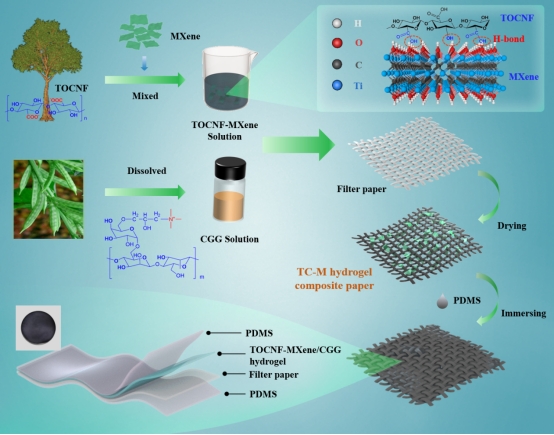 本项工作以TEMPO氧化纤维素纳米纤维(TOCNF)为主要原料,通过与阳离子瓜尔豆胶(CGG)自组装形成水凝胶,在纤维素纸表面封装MXene,构建了一种电磁屏蔽复合纸(TC-M)。结果显示,复合纸的电导率为3843 S·m−1,EMI屏蔽效能(EMI SE)达到49.37 dB,且组装形成的双层复合纸EMI SE高达73.99 dB。此外,聚二甲基硅氧烷(PDMS)的引入保护了复合纸的EMI屏蔽性能,改善了复合纸的耐用性。