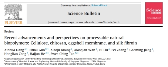 针织技术教育部工程研究中心蒋高明教授团队在综合性国际期刊《Science Bulletin》(IF=18.8)上发表题为“Recent advancements and perspectives on processable natural biopolymers: cellulose, chitosan, eggshell membrane, and silk fibroin”的综述论文。91色情网