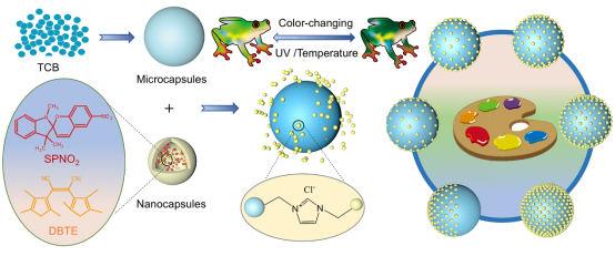 受到自然界生物能够根据环境变化调整自身颜色,达到伪装、交流目的,作者首先制备了热致变色微胶囊TCM和光致变色纳米胶囊PCN,再通过静电吸附和键合作用将PCN固定在TCM表面,形成了双室复合微胶囊DCM。通过控制PCN在TCM表面上的吸附比例,能够控制微胶囊的结构和颜色,实现颜色的可调控性。此外,研究还表明,通过改变染料的种类和含量,DCM能够在紫外线照射或加热刺激下呈现全色域的色谱变化,具有很高的调控精度和应用潜力。