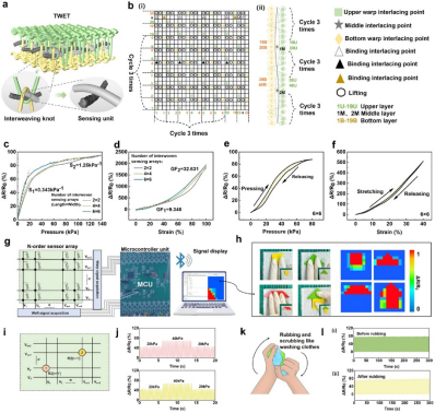纺织研究所孙丰鑫研究团队基于“超构织物(meta-textile)”结构设计理念,开发出一种智能三重编织电子织物(TWET)。该织物不仅具备高灵敏度的多模态传感能力,还兼具红外辐射冷却与微液量的汗液快速传导等多重功能无缝集成,显著提升了穿戴过程中的热湿舒适性。这一“结构诱导功能”的超构织物设计理念,为新一代智能可穿戴设备提供了高度集成、可规模化生产的解决思路,展示出广泛的应用前景和工程化潜力,有助于推进可穿戴技术在户外运动、健康监测等领域的实际应用。相关成果以“Knot-Patterned Treble-Weaving Smart Electronic Textiles With Advanced Thermal and Moisture Regulation for Seamless Motion Monitoring”为题发表于《Advanced Functional Materials》,91色情网