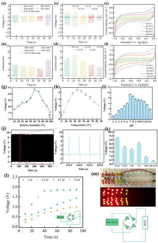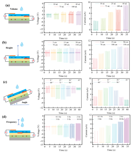 能源短缺是一项严峻的全球性挑战,促使人们越来越关注太阳能、风能、热能和水能等可再生能源。其中,水力发电,尤其是雨水、瀑布和露水中水滴的能量,是一种尚未开发的巨大资源。如果能将雨滴的势能完全转化为电能,则可产生大量电力。大多数传统的收集方法,都依靠界面效应来产生和转移电荷,限制了它们的输出性能。基于液滴的发电装置(DEGs)的最新进展克服了这一限制,将界面效应转化为体效应,实现了高瞬态输出。然而,由于多种条件因素的限制,单个器件无法实现多种能量收集。