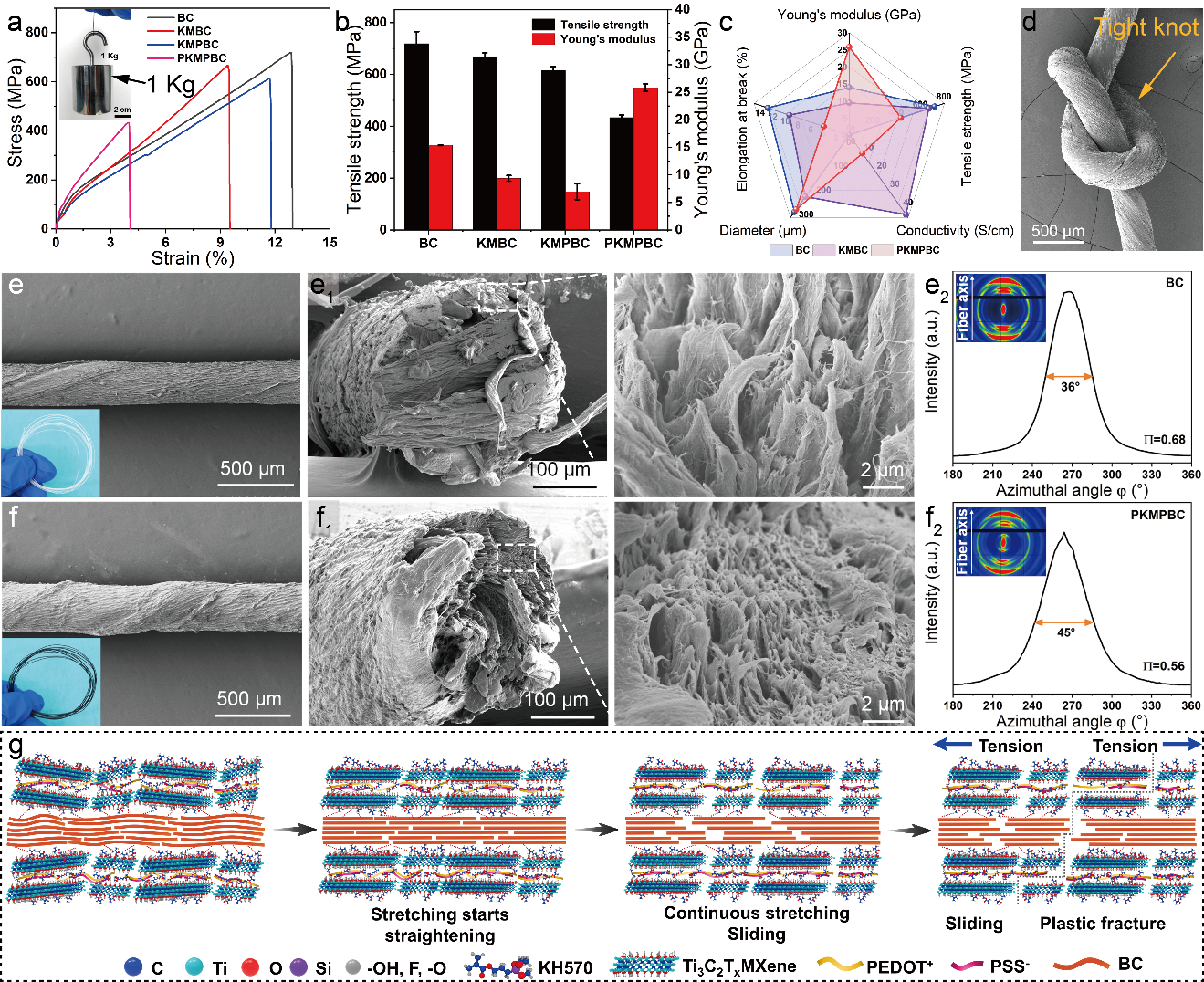 图3表明,BC纳米纤维在拉伸取向后形成高取向结构(取向因子0.56),为纤维提供优异的载荷传递与抗裂能力。纤维具有433.8 MPa的拉伸强度与25.9 GPa的杨氏模量,同时具备良好的打结/弯折可靠性与环境稳定性,为高强度可织造导电纤维奠定基础。