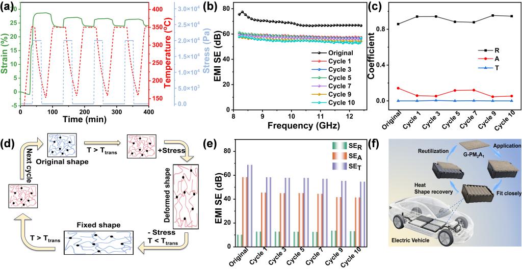 该策略赋予了复合材料卓越的环境适应性和使用寿命。实验表明,该薄膜在经历强酸腐蚀、300W超声波清洗、250°C高温以及-196°C液氮超低温等严苛条件后,仍能保持极高的屏蔽稳定性。更为重要的是,得益于聚酰亚胺基体固有的形状记忆特性,该复合薄膜在经历多次“变形-加热恢复”循环后,依然能够完美贴合复杂的三维结构,且电磁屏蔽效能稳定维持在60 dB以上(图3)。与传统的不可逆静态屏蔽材料相比,这种兼具阻燃性、优异机械强度(拉伸强度5.72 MPa)和高导电性(156 S/cm)的可重复利用设计,为新能源汽车电池包的“绿色装甲”防护及先进轻量化柔性电子系统提供了可持续的新途径。