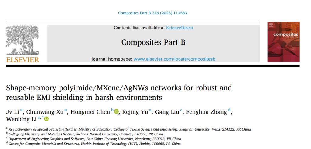 先进纤维与纺织复合材料研究团队在复合材料领域顶级期刊《Composites Part B: Engineering》(IF=14.2)上发表题为“Shape-memory polyimide/MXene/AgNWs networks for robust and reusable EMI shielding in harsh environments”的研究论文。该研究提出了一种基于形状记忆聚酰亚胺(PI)的梯度导电网络构建策略,通过将二维MXene和一维银纳米线(AgNWs)组装到静电纺PI纤维基底上,成功制备了具有“静态屏蔽”到“动态适应”转变能力的柔性电磁屏蔽复合薄膜。该研究为开发适用于复杂形变和严苛环境的新一代电子防护材料提供了创新思路。91色情网