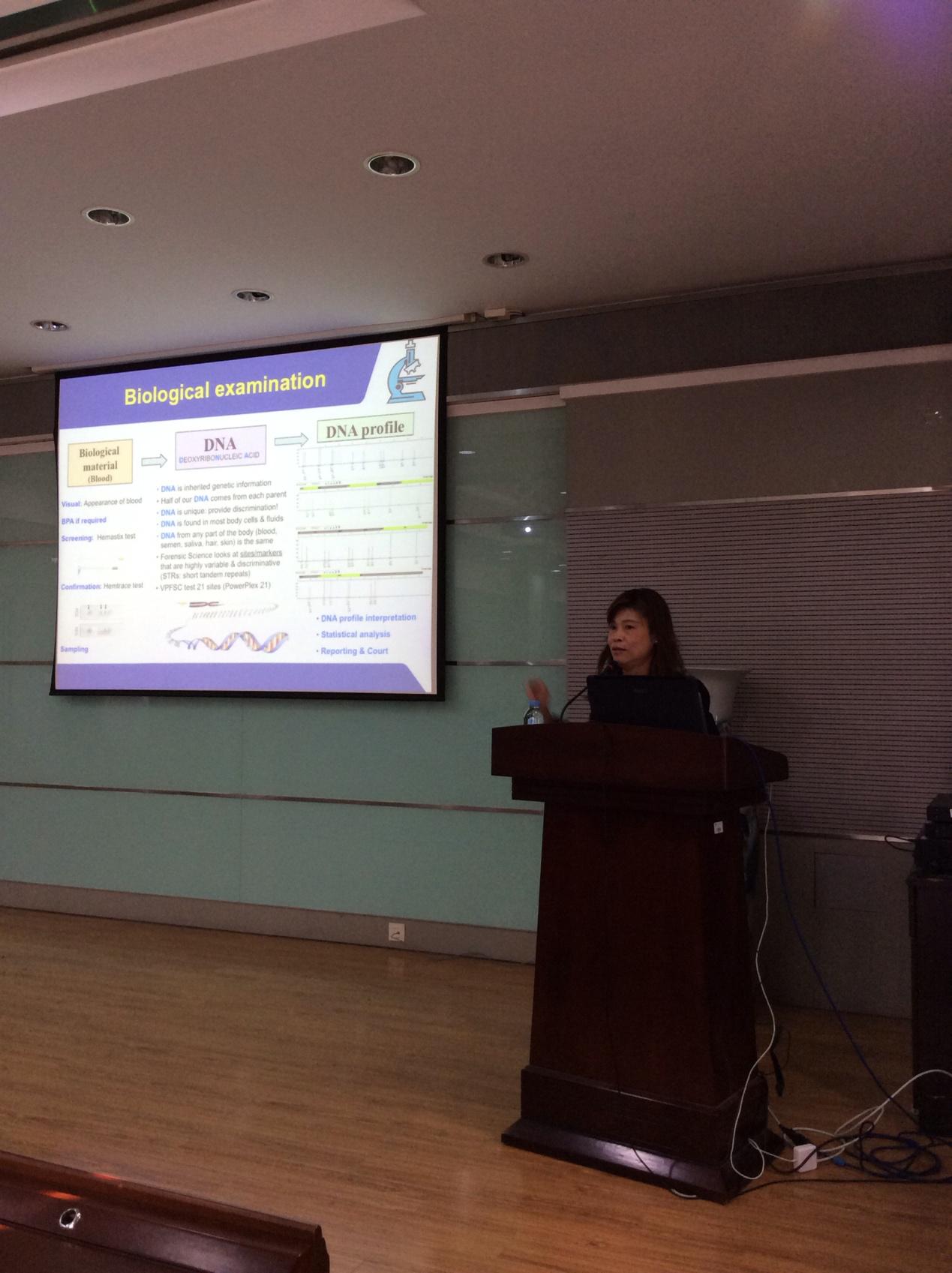 纺织工程、化学和科学系教授,主要研究方向是刑侦科学中的血迹分析。Stephen Michielsen教授主要从血迹在纺织品上的模式分析、人体排汗结束时间对血痕的影响以及纺织品结构对血迹的影响。通过纺织品上的血迹分析,还原犯罪现场。Stephen Michielsen教授最近获得美国国家司法研究所(US National Institute of Justice)研究项目,研究血迹与纺织材料的相互作用。Yuet Chang博士是澳大利亚维多利亚州警署的一名法医,毕业于弗林德斯大学,主要研究刑侦科学中的DNA技术。Yuet Chang博士结合自己在法医生物学领域超过十八年之久的工作经验,向我们讲述了她在维多利亚州警署负责犯罪现场与纺织品有关的检查、取证、提供书面报告的经历。Yuet Chang博士曾研究运用近红外光谱(NIR)技术检测深色服装在多重波长光源下的精液、唾液和血迹。