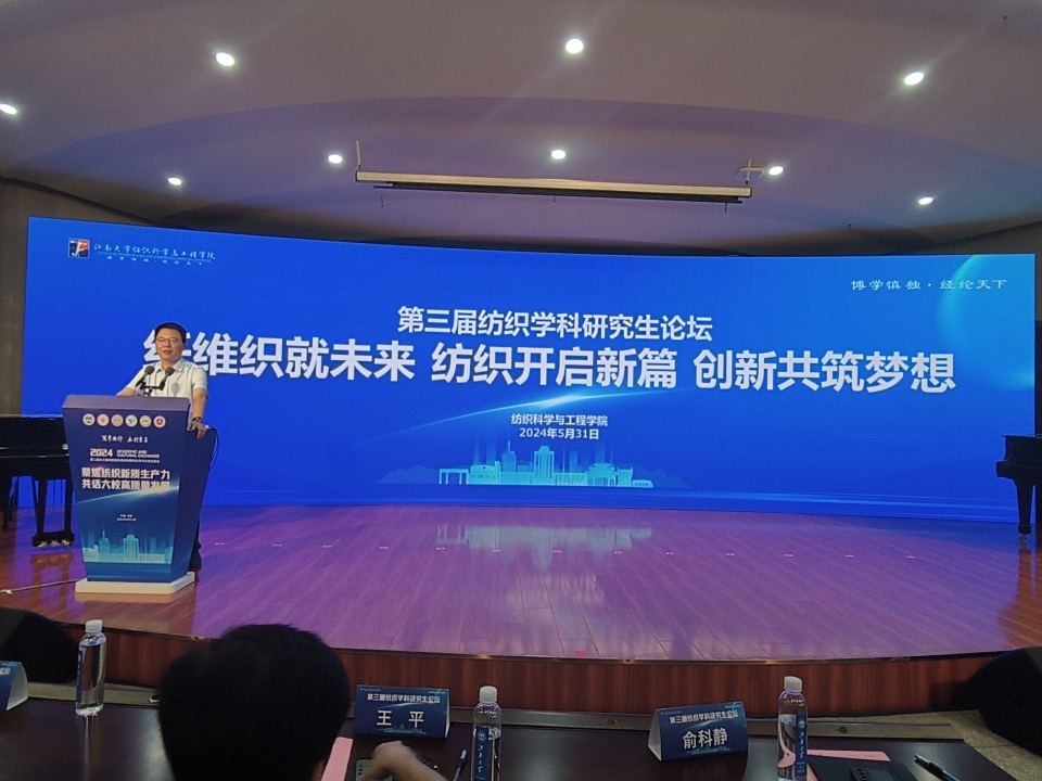 马丕波在讲话中表示,纺织学科研究生论坛是学生展示最新学术成果、促进师生交流、提升科研能力的重要平台。他鼓励广大研究生把握好学术交流机会,加强学术成果和科研经验的互动与探讨,要心怀国之大者、勇攀科研高峰、立志科创报国,主动融入服务国家重大发展战略中,为学科发展贡献青春力量。