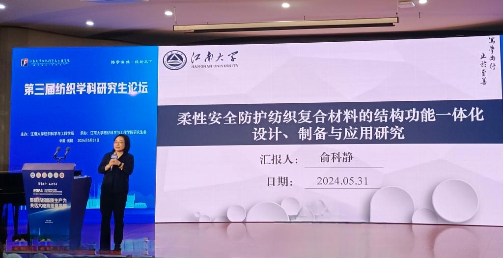 俞科静以《柔性安全防护纺织复合材料的结构功能一体化》为题,就柔性电子屏蔽、光热、安全防护功能一体化的复合纺织品展开论述,详细介绍了实现功能纺织品的技术路线,通过具体详实的例子展现了纤维在不同领域的广泛应用和前沿技术,让同学们身临其境感悟学科魅力,也勉励研究生敢想敢干“all ideas start with imagination”。