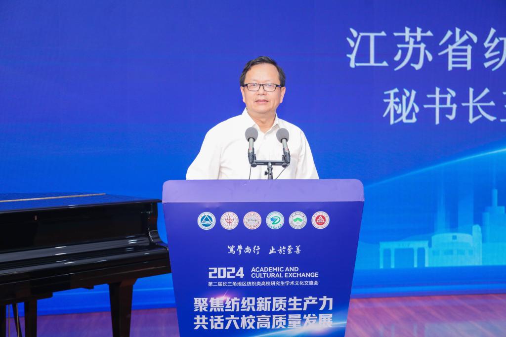开幕式上,朱飞代表学校向第二届长三角地区纺织类高校研究生学术文化交流会的成功召开表示祝贺。他表示,长三角地区纺织类高校是纺织高端人才培养的主阵地,长三角纺织类高校师生齐聚江南,聚焦纺织新质生产力,共话六校高质量发展,是贯彻落实党的二十大关于教育科技人才一体部署,培养造就新时代纺织拔尖创新人才的生动实践,也是各高校加强交流、促进合作、共同发展的重要举措。他希望各兄弟高校共同探寻研究生人才培养和学科建设的新路径,携手聚力推动新时代纺织学科研究生教育的内涵提升和高质量发展;瞄准纺织科技前沿和关键领域,努力做好科技创新与产业创新深度融合,为纺织行业新质生产力的加快形成提供人才支撑和智力支持。
