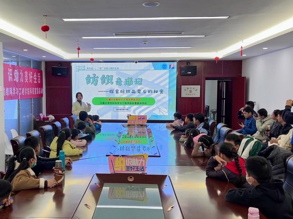 “织”行科普实践团走进无锡市石塘社区新时代文明实践站,携手育红山水小学展开“纺织奇遇记——探索纺织品背后的秘密”纺织知识科普宣讲活动,将纺织知识带去寻常百姓家,用“织”识助力美好生活。