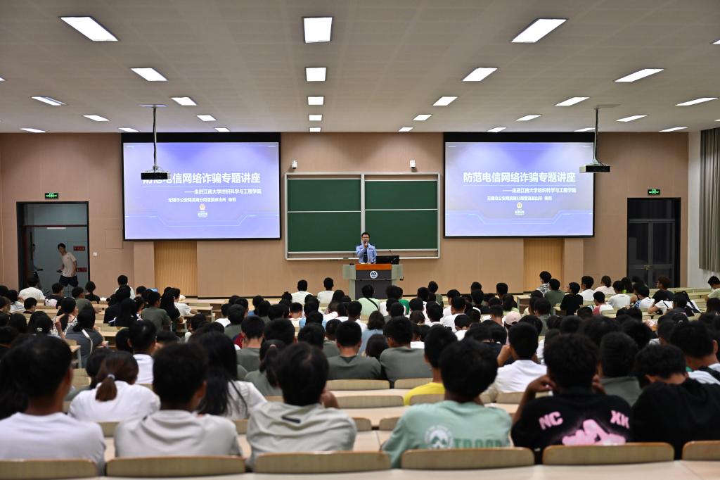 无锡市公安局滨湖分局雪浪派出所民警杨恺受邀以“防范电信网络诈骗”为主题开展宣讲。他从电影《孤注一掷》引入,介绍了当前网络诈骗防范的严峻形势,通过大量大学生受骗案例,生动形象地讲解了新型网络电信诈骗的种类、作案方式以及如何甄别诈骗陷阱等。针对经常发生的冒充客服、网络刷单、校园贷等骗局,他告诫同学们不轻信、不透露、不转账,多一分警惕,远离诈骗。