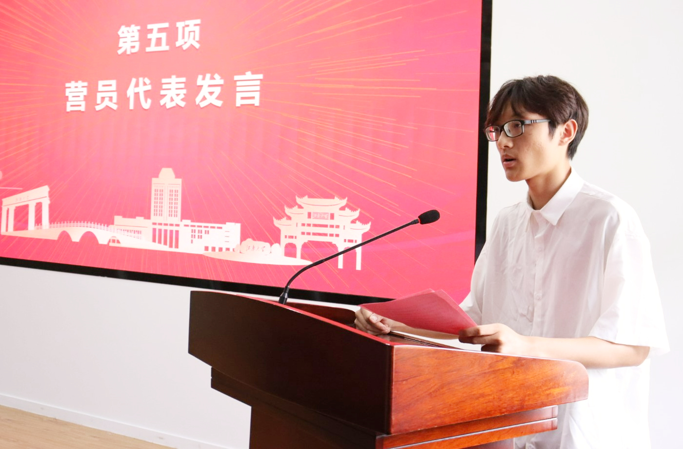 轻化2201班肖紫炀同学作为营员代表发言,他分享了自己从对专业懵懂无知到坚定专业认同的成长过程,训练营的学习得以将理论与实践相结合,锻炼了小组协作能力、提高了个人创新思维。他号召同学们要以此为起点,怀着满腔的理想与热情,找好自己的赛道继续奋力奔跑。