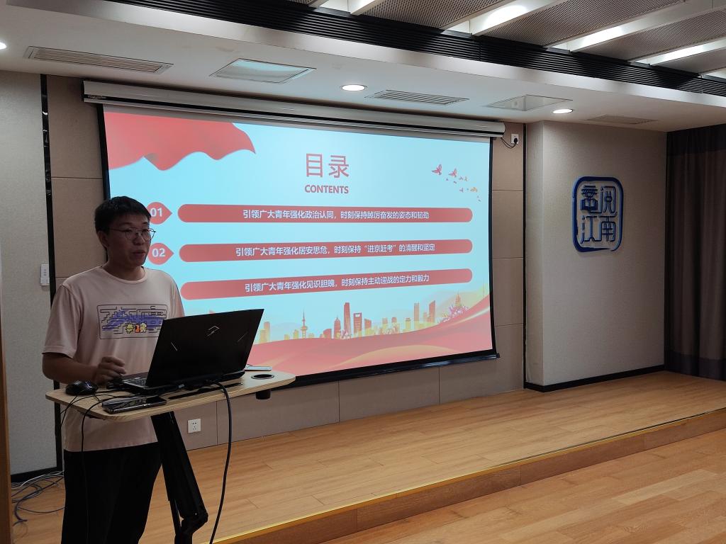 硕士第三党支部党支书原韵以视频的形式带领党员们学习贯彻习近平新时代中国特色社会主义思想,重点讲解“红船精神”,倡议全体党员在新的实践中继承和弘扬“红船精神”,不断强化前列意识,切实把“走在前列”的要求体现到精神状态上,贯彻到衡量标准上,落实到各项工作上。
