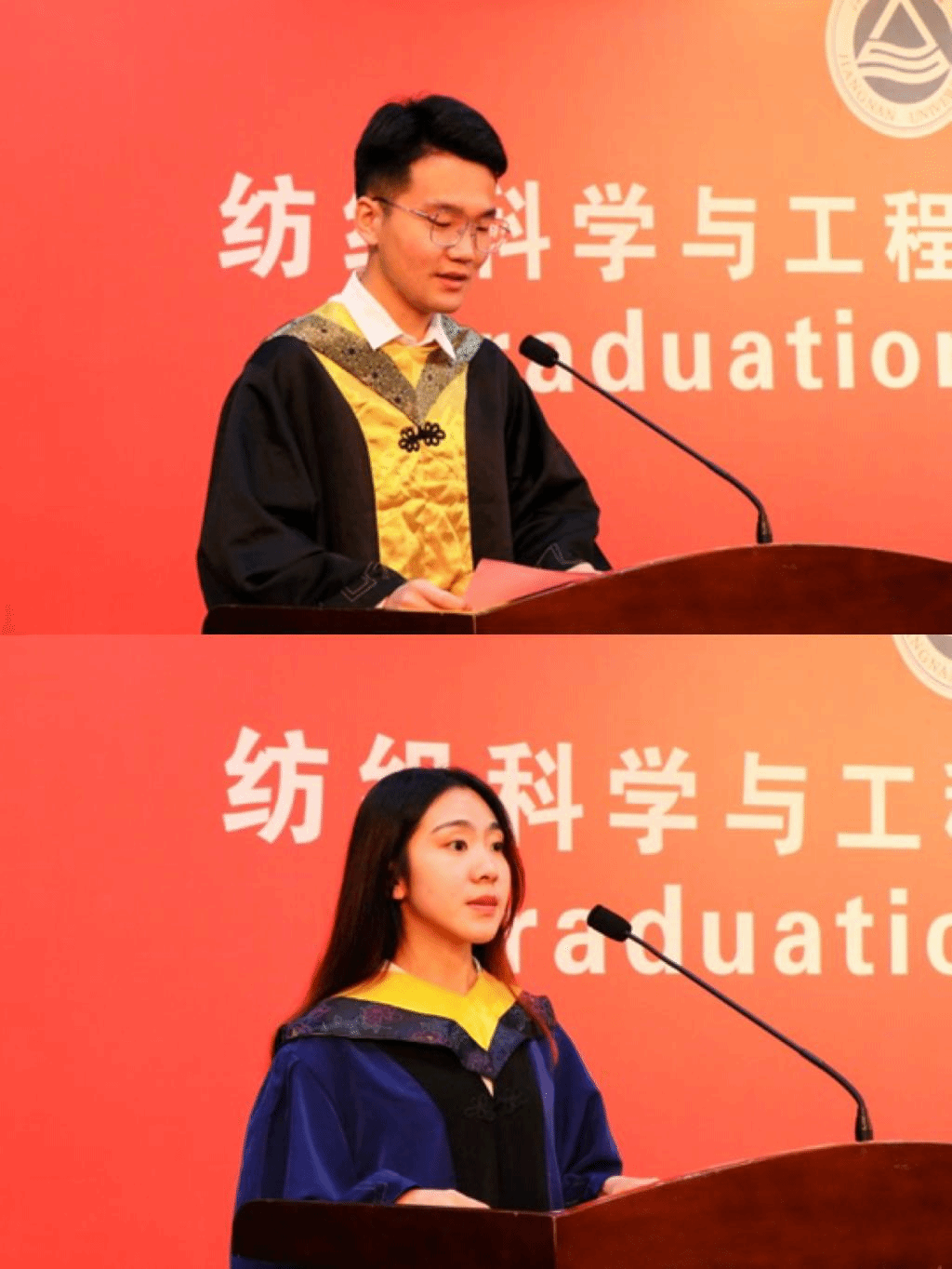 18级本科生王傲、19级硕士研究生沈慧颖代表毕业生发言,分享在江南的点点滴滴,寄语未来。他们表示,将牢记师长嘱托,在新的人生征程上继续坚定信念,奋力前行,让青春在不懈奋斗中绽放绚丽之花。