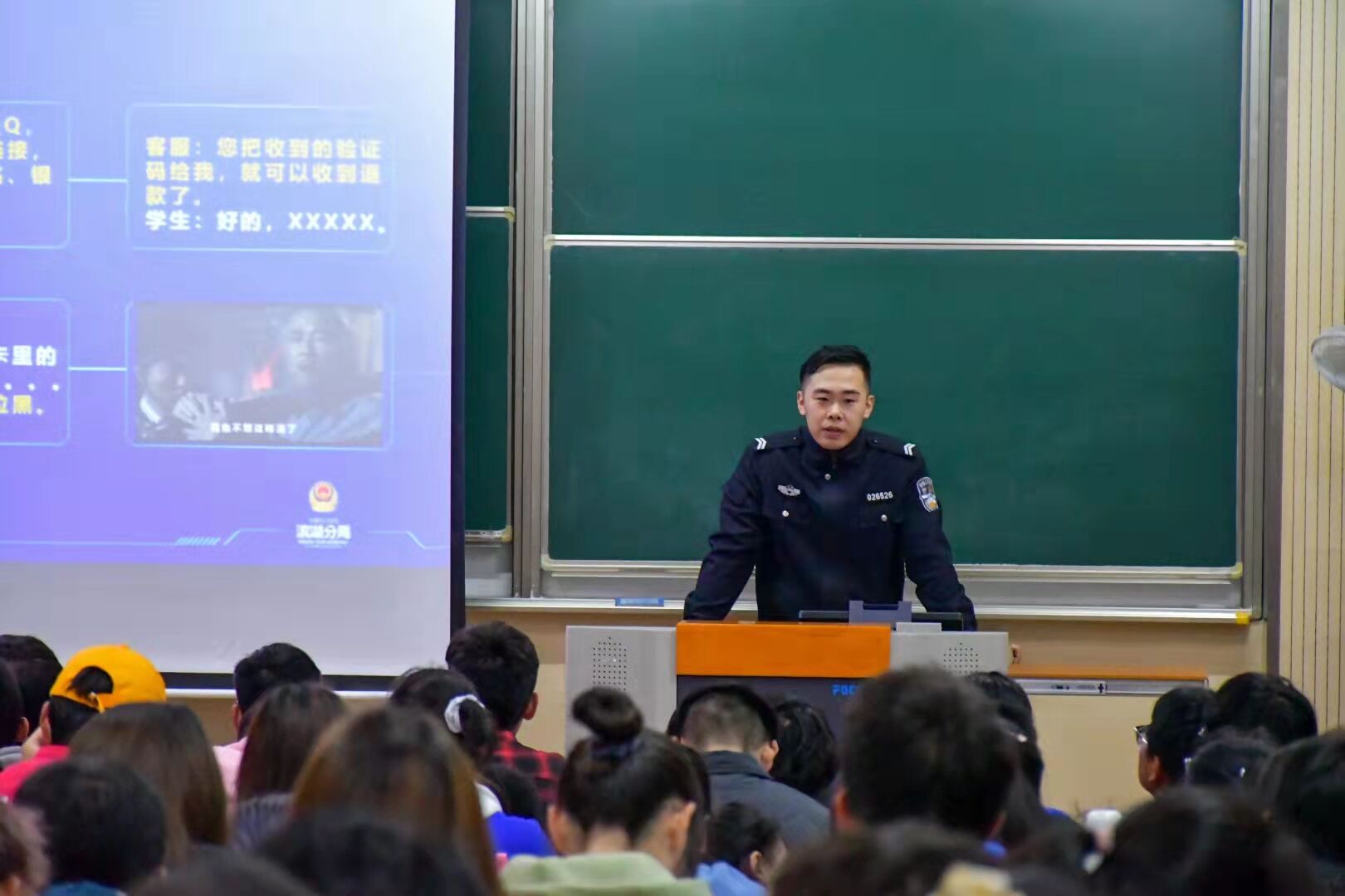 在1教1B103教室举办以防范网络诈骗为主题的安全教育讲座。讲座由无锡市滨湖区雪浪派出所刘啸警官主讲,2021级全体本科生参加此次活动,讲座由年级辅导员张旭主持。