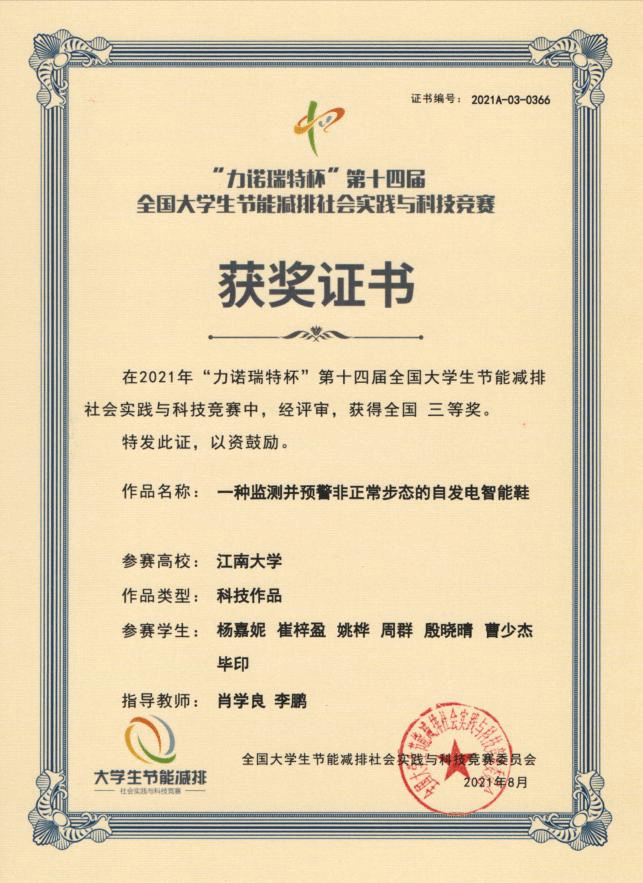 肖学良老师指导、纺织1802班杨嘉妮同学负责的科创作品《一种监测并预警非正常步态的自发电智能鞋》(参赛学生:杨嘉妮,崔梓盈,姚桦,周群,殷晓晴,曹少杰)荣获全国三等奖。