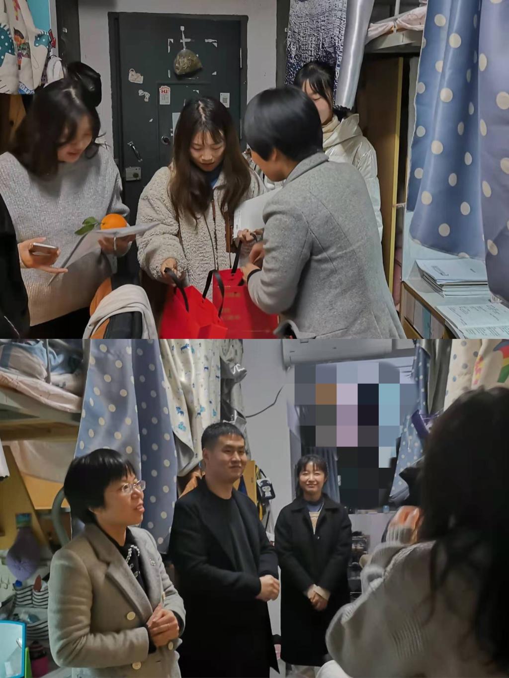 党委副书记陈艳君,毕业班辅导员吴丹来到学生宿舍等地慰问考研学生,送上学院精心准备的笔袋和橙子。