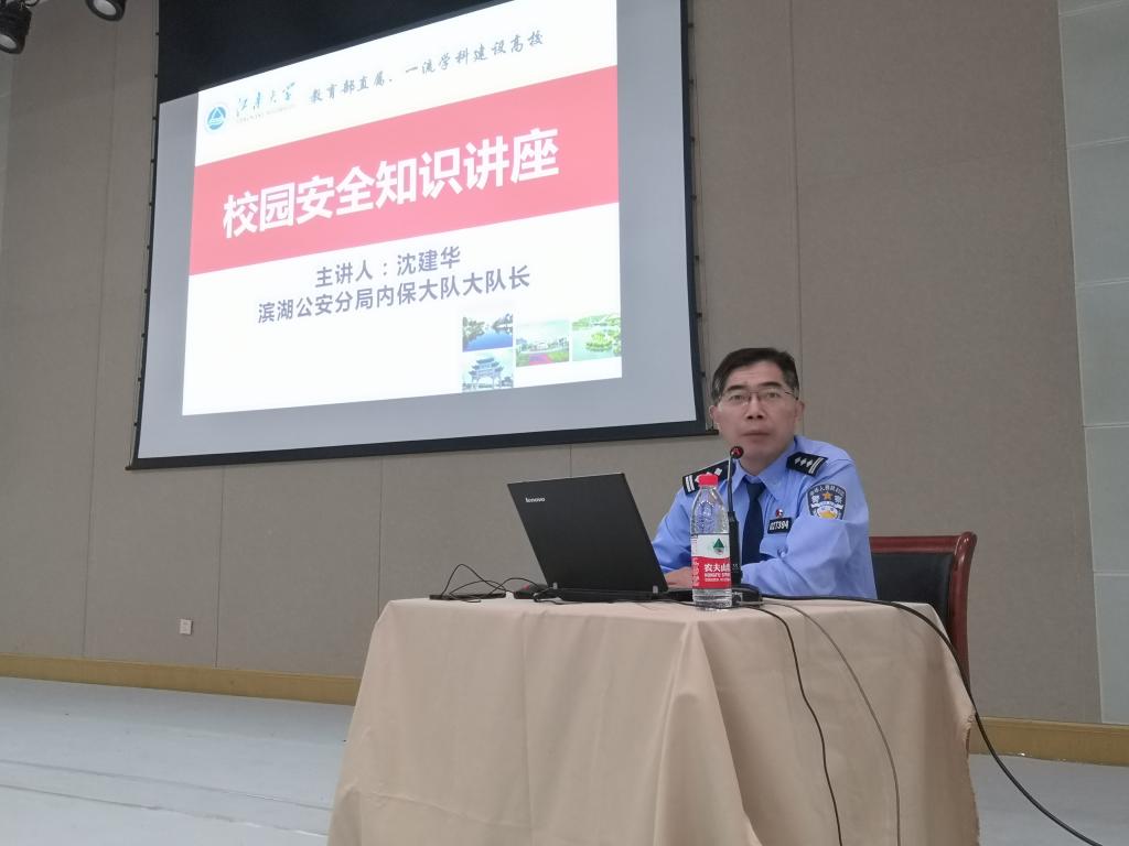 在学院C区活动中心举办2020级本科生安全知识讲座,本次讲座邀请无锡市滨湖区公安分局内保大队大队长沈建华警官主讲,讲座由学院2020级新生辅导员陈裕主持。