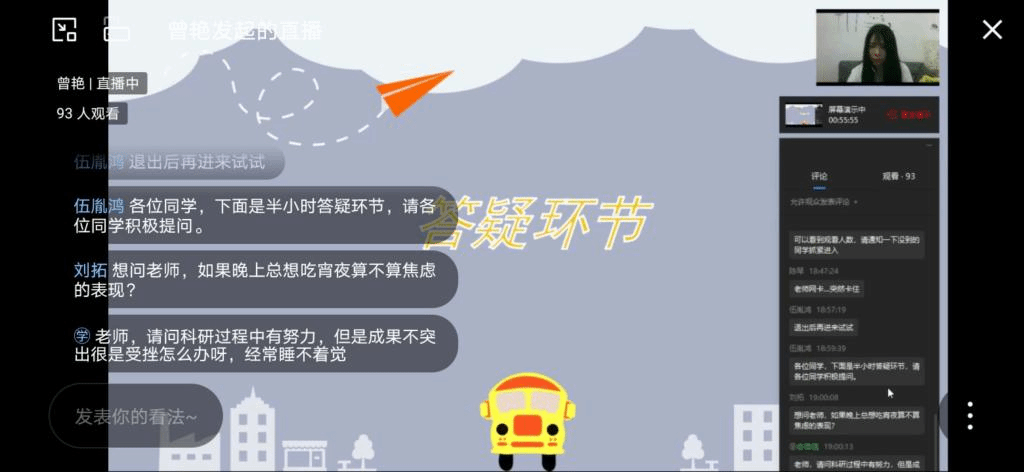 讲座过后是由曾艳老师进行的线上答疑环节。同学们针对生活、学习中遇到的各类问题积极提问,老师对此做了耐心细致的解答,并鼓励同学积极面对问题,以饱满的精神状态迎接研究生生涯。