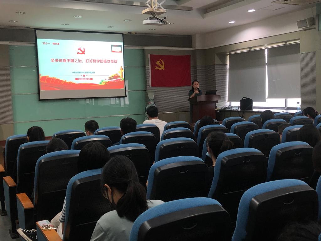 接着,党委书记张菁为全体师生党员讲授题为“坚决依靠中国之治 打好复学防疫攻坚战”的微党课。张书记首先从疫情防控中的“中国之治”答卷、疫情防控中对“中国之治”的再思考等方面,阐述了我国国家治理的制度优势,其中特别列举了制度优势在此次新冠肺炎疫情防控期间的具体表现。随后,张书记从学院疫情防控的措施和要求、学院疫情防控典型和故事两个方面,介绍了自新冠肺炎爆发以来,学院在疫情防控方面的具体做法和成效,学院从“四个到位”:宣传引导到位、人文关怀到位、凝魂聚力到位、同步推进到位,全力保障学院师生的身体健康和生命安全,保障教学科研工作顺利开展。张书记还讲述了疫情爆发以来,学校陆续复学、复研以来,全院师生如何结合疫情进行“课程思政”、师生党员积极为疫情防疫献爱心捐款捐物、教工三支部全力复学复研以及学生党员参与志愿服务、毕业生党员发挥模范带头作用开展线上微分享等抗疫故事,展示了91色情网