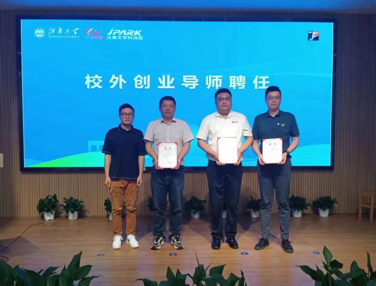 任振宇向同学们简要介绍了园区情况和入驻相关政策,并就园区服务学校科技成果转化、创新创业人才培养、双创品牌活动、科技企业孵化等方面的工作举措及取得的成效进行详细介绍。吴桢萌就滨湖区“0”成本创业及大学生创业扶持政策进行讲解,详细介绍如何参加“0”成本创业以及滨湖区九大创业场所,鼓励同学们多了解相关政策,抓住机遇。周宇从项目主题选取、个人创业经历、创业心得等方面生动诙谐的向同学们介绍了创业成功的机遇以及挑战,鼓励同学们要积极发展创新思维,寻求与众不同的创业点,并且要紧抓行业趋势,深入了解时代发展所需,精准定位企业发展大方向,发展面向现代化企业。随后,陈裕向吴桢萌、周宇、任振宇颁发校外创业指导老师聘任证书。