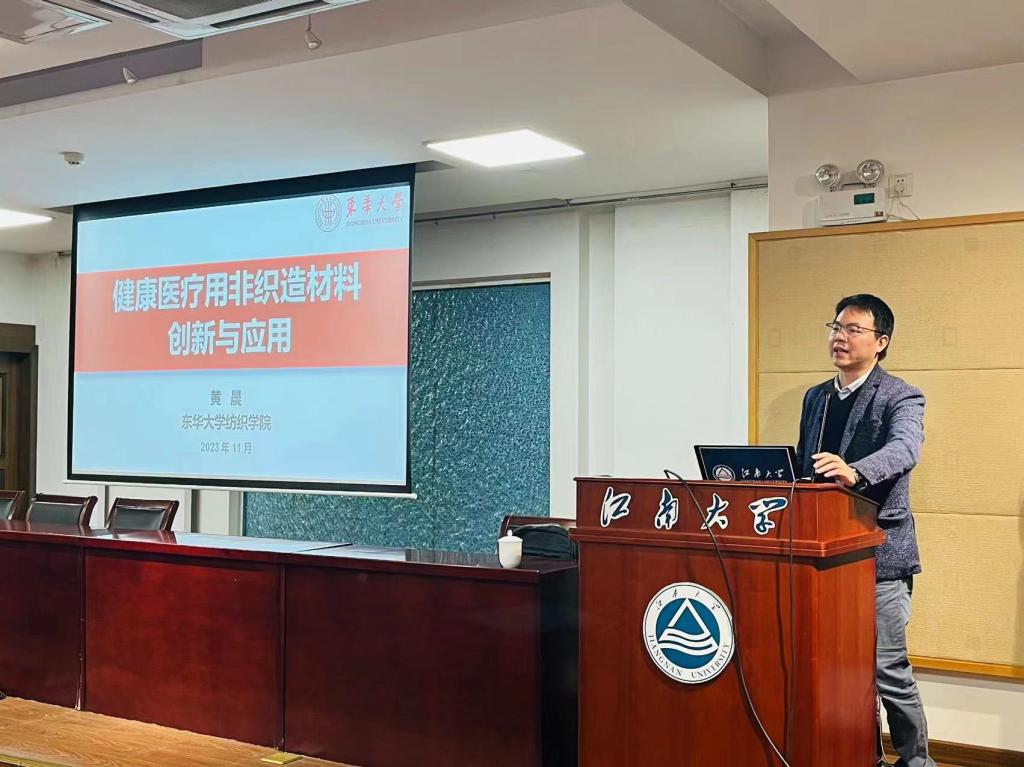 黄晨以《健康医疗用非织造材料的创新与应用》为题,围绕定向导流非织造材料、健康检测非织造材料、非织造基医疗健康制品三个方面,从材料的定义、制备方法以及在各个健康医疗领域上的应用为大家做深入讲解,他还结合自己与团队的研究成果,通过大量的图片与视频向师生展示了新材料与新科技的发展现状与未来趋势。