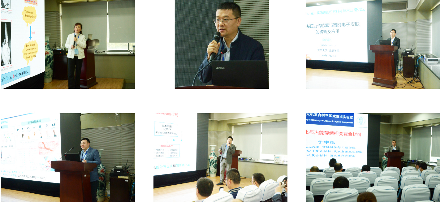 论坛紧紧围绕纺织材料领域关键学术难点和热点问题进行了学术交流与共享,共14个主题报告。清华大学谢续明教授的“多重键网络(MBN)水凝胶的结构性能调控及其功能应用”、南开大学刘遵峰教授的“几何结构的功能纤维及应用-人造蜘蛛丝、人工肌肉、柔性电子与制冷”、东华大学张清华教授的“纺织新材料—聚酰亚胺纤维生产及应用”、苏州大学严峰教授的“聚离子液体功能材料”、青岛大学隋坤艳教授“多糖基仿生智能水凝胶”、北京化工大学于中振教授“石墨烯/聚合物纳米复合材料”、江苏大学施伟东教授“纳米材料宏量制备及其光/电催化性能”、东华大学李召岭教授分别以 “纤维基压力传感器与智能电子皮肤的构筑及应用”、武汉纺织大学王栋教授“纤维材料在生物传感领域的研究及其应用”、浙江理工大学戚栋明教授“成纤流动场中低维材料的取向填充行为与重排成型机制”、东华大学闫建华研究员“柔性纺织固态锂电池”、南京工业大学暴宁钟教授“高性能柔性储能纤维”、苏州大学方剑教授“纳米纤维材料在能量收集与存储中的应用”、东华大学孙宾教授分别以 “纤维级有机无机杂化功能材料的构筑及其纺织工业应用”,报告精彩纷呈,与会嘉宾与师生提问踊跃热烈。上午论坛由刘天西教授和谢续明教授主持,下午的论坛由暴宁钟教授和丁彬教授主持。