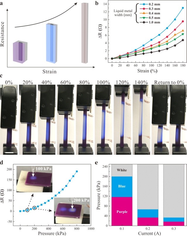 纺织服装学院葛明桥教授团队发现逻辑决策可以在材料层面完成,而不依赖半导体运算。受到章鱼手臂中分布式神经网络的启发,团队展示了一个完全柔软,可拉伸的有机硅复合材料(图1)。该有机硅复合体掺杂有热致变色颜料并可以受液态金属的支配,液态金属的变形能力使焦耳热发生几何变化加热,从而实现可调的热机械着色及感知触觉和应变(图2)。在更复杂的电路中,变形的液态金属可以重新分配电能到远端部分,以一种触觉“输入”转换成数字比色“输出”的方式来实现逻辑运算(图3)。