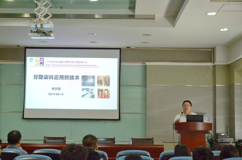 纺织服装学院院长付少海教授从五个方面介绍了分散染料应用新技术,其中包括分散染料超细化加工技术、耐碱性分散染料一浴法染色技术、免还原清洗分散染料连续染色技术、涤棉织物漂染一浴法染色技术、水基分散染料转移印花,他指出在科研的同时应该多接触企业项目,了解亟需解决的产业化生产问题。