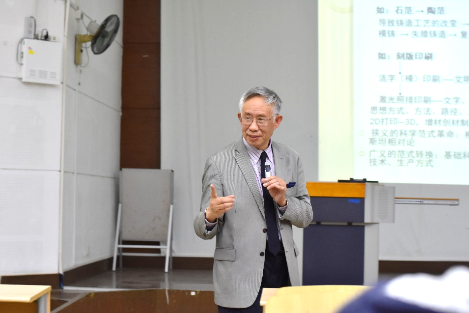 顾教授首先以问题导入模式,激发同学们的兴趣,活跃了讲座气氛,引用习近平主席在《纪念五四运动100周年大会》中提到的“到新时代新天地中去,让理想信念在创业奋斗中升华,让青春从创新创造中闪光”来说明新时代新青年的使命。接着从什么是范式与范式革命、新科技(范式)革命开启的人类新纪元、从反常态到新常态分析中国纺织不均衡、不充分以及创新和中国纺织的可持续发展、范式转移中我们的角色和任务五个方面展开讲座内容。随后提到了新时代的特征:颠覆性和创新性,多个角度分析了科学技术和市场快速转化的原因,并从新科学、产业革命来分析中国纺织业的发展。科学的范式是人类时代进步的唯一动力,范式革命是新的理论核心架构的形成过程,科学革命的开始就是范式转移的开始,顾教授从范式转移的两个角度创新和可持续发展,以及转移中的角色和任务,阐述了新时代我们新青年该有的态度。