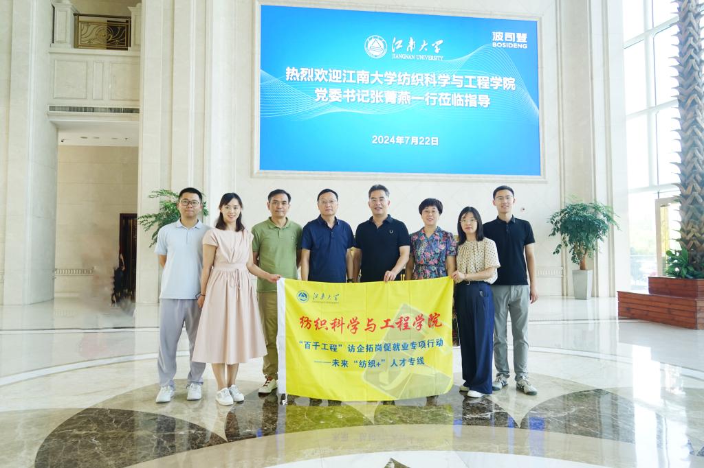 党委书记张菁燕率队赴波司登集团开展党建共建暨访企拓岗交流。无锡市纺织工程学会理事长、学院教授王鸿博,学院党委副书记、副院长杨莉勤,师生党支部代表参加调研。学院94届校友、波司登集团高级副总裁兼波司登事业部总经理芮劲松,集团党委副书记、总裁助理、全国工商联纺织服装业商会秘书长朱军,集团事业部人力资源部总监黄琳,集团党建经理郭小芳热情接待。