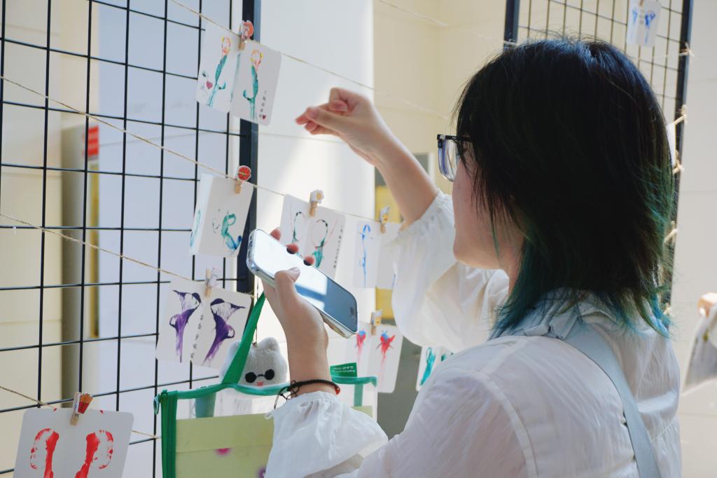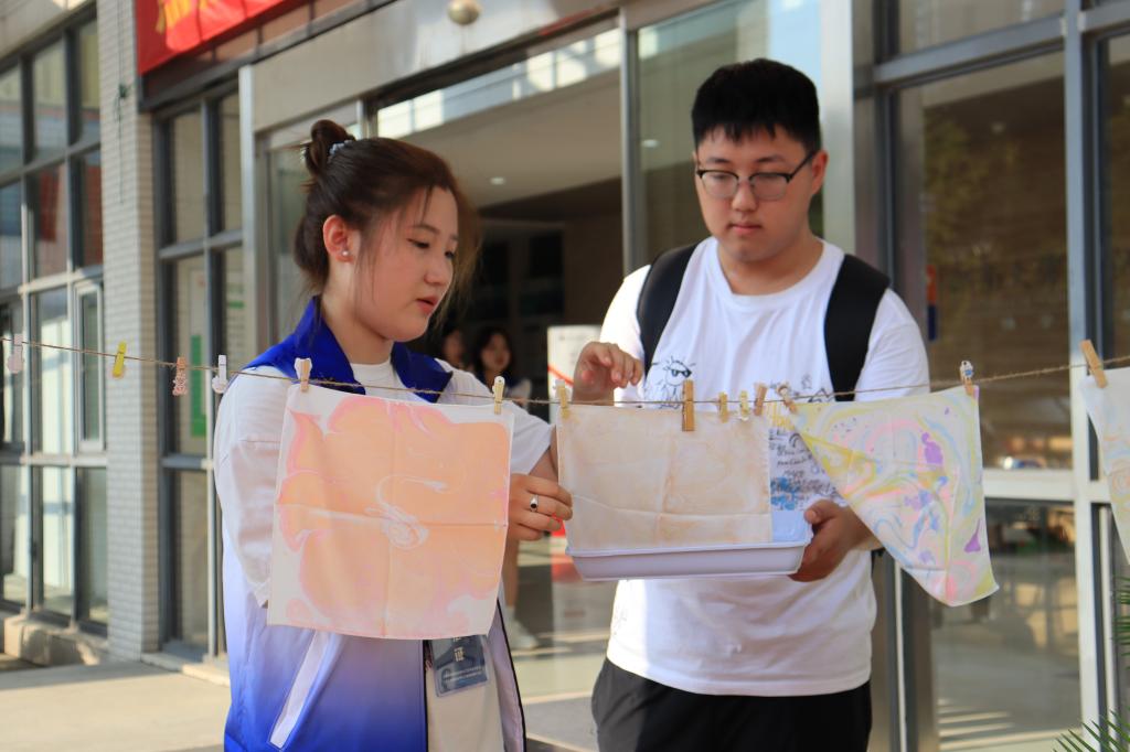 在“传承水拓非遗文化”互动区,以美育润心作为切入点,沉浸体验与心灵启迪并重,初识学科特色。新生经过调色、创作、水拓等步骤亲手制作水拓丝巾,兼具心理健康教育和非物质文化遗产传承双重功能。