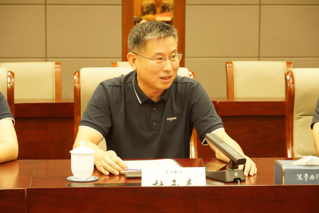 杜玉春介绍了泰和新材集团的发展历史、创新平台及近年来的科技成果等情况。他提到,集团创办30余年以来,依靠核心技术创新能力和完善的产业链服务,聚焦高性能纤维主业进行原创性、引领性技术攻关,已经成为国际高性能纤维产业龙头企业。他期待通过与江南的创新合作,以高目标引领推动双方科研成果再获新突破。