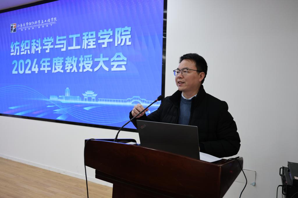 会议伊始,付少海首先作2024年度学院工作报告。他充分肯定了过去一年学院在国家自然科学基金、军工科研特色、科研获奖以及人才培养等诸多领域取得的显著成绩,并对学院完成的总体任务目标、标志性成果、教学与科研、各团队对标对表情况进行了深入透彻的分析。同时,他以学院前瞻发展的视角,提出了学院未来的策略规划与发展方向,强调在新时代、新形势发展的大潮中,学院必须坚持“四个面向”,精准定位学科方向,紧密围绕国家战略需求,不断拓展“纺织+”学科的新内涵,致力于打造具有鲜明特色、在国际上享有盛誉、国内一流的先进纺织学科。针对学院当前面临的问题与挑战,他明确提出了2025年的工作计划,号召学院全体师生接续奋斗,为学院建设的再攀登全力贡献智慧与力量。