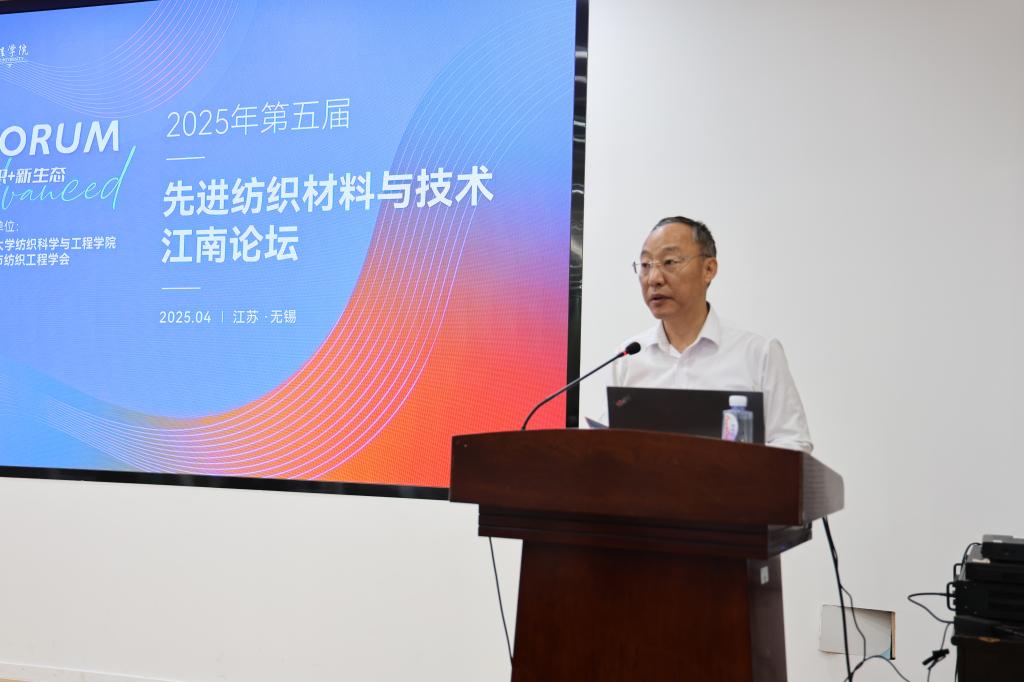 朱飞代表学校致辞,他向莅临论坛的各位学者和嘉宾表示热烈的欢迎和感谢。希望各位专家学者相聚于此,以学术交流赋能纺织学科创新发展,推进先进纺织技术交叉融合。希望青年教师和学生以此次论坛为契机,加强先进纺织材料与技术科研探索,进一步提高我校纺织学科科研实力。