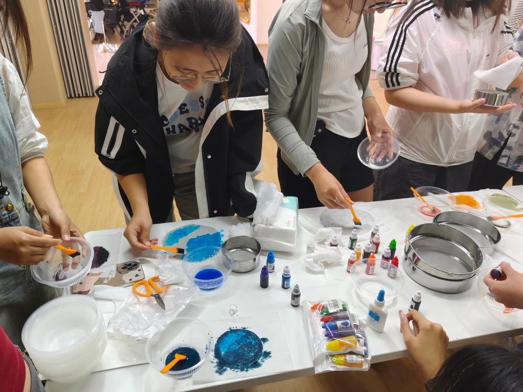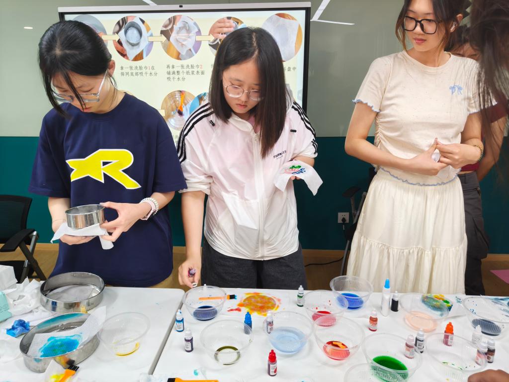 活动筹备阶段,学院学生会文艺部广泛收集日常废纸,将其打碎重组为纸浆原料。在活动现场,参与者亲身体验古法造纸技艺:捞浆、铺巾、脱水、拓印……每一步都需细致耐心。工作人员现场示范,“用筛网均匀捞起纸浆,再以纸巾吸干水分,最后点缀颜料创作图案”,原本废弃的纸张在巧手中焕发新生。同学们或书写寄语,或绘制图案,将祝福融入每一张独一无二的手工纸中。