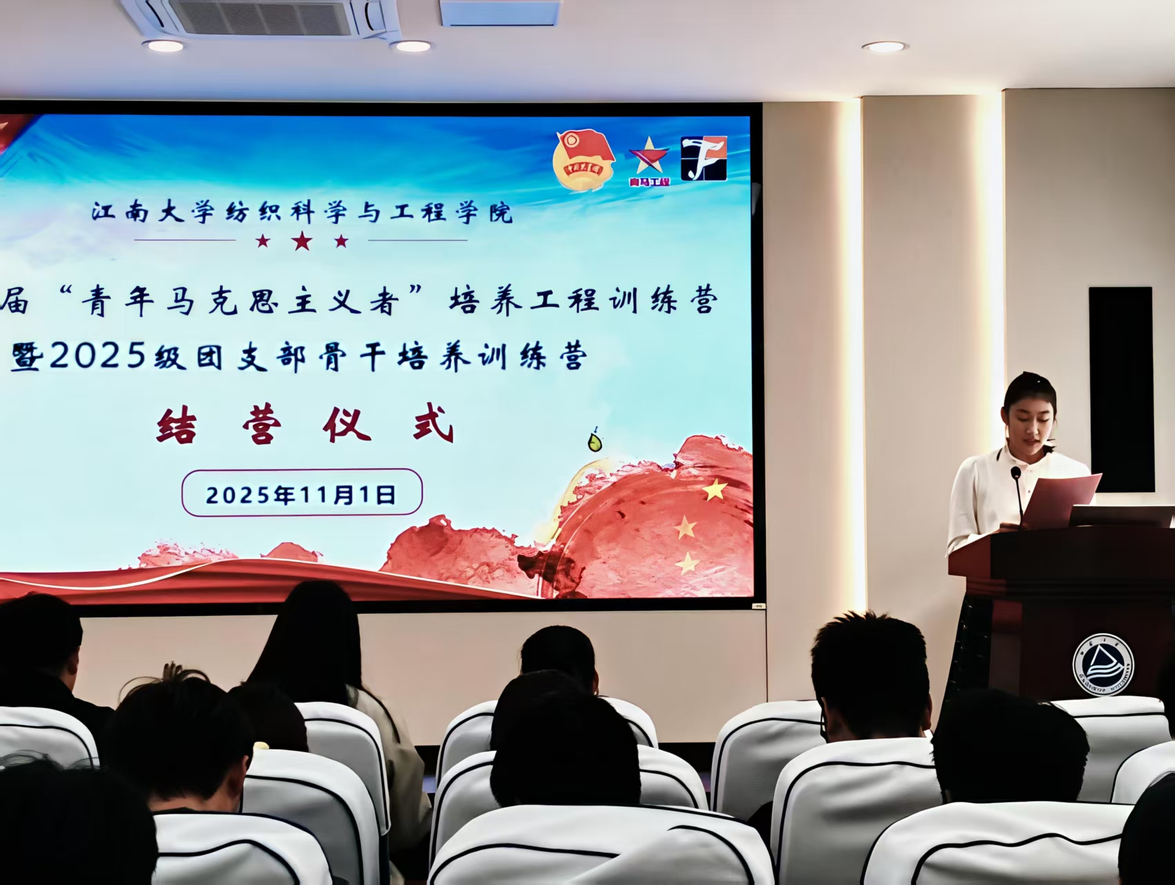 第十一届“青年马克思主义者培养工程”训练营暨2025级团支部骨干工作培养训练营结营仪式在学院A103会议室顺利进行。学院学工办主任兼分团委书记任学敏、2025 级本科生辅导员孙洲龙、学生会执行主席周珈宇、学生会主席团王生域, “钱之光”“张闻天”“雷锋”特称团支部团支书、训练营全体学员以及 2025 级本科生班团骨干参加仪式。学生会团委通讯社胡婧文淇主持。
