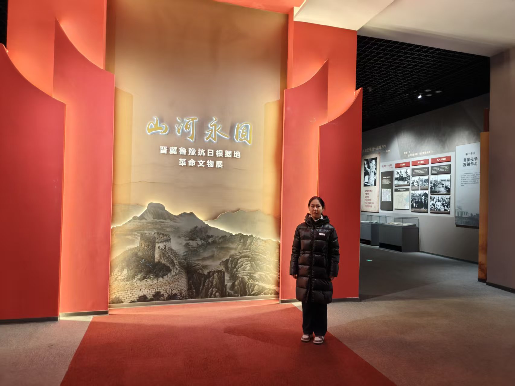 房萍同学走进山东博物馆,参观 “山河永固 —— 晋冀鲁豫抗日根据地革命文物展”,被烽火岁月里的革命故事深深震撼。展厅中的文物与史料,生动还原了抗日军民视死如归、宁死不屈的英雄模样,也让她深刻领悟到,如今的山河无恙,皆是无数先烈以热血铸就。作为新时代大学生,她立志将抗战精神铭记于心,把爱国情怀转化为强国建设、民族复兴的青春行动。