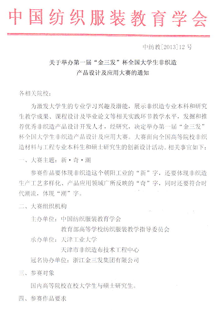 关于举办第一届“金三发”杯全国大学生非织造产品设计及应用大赛的通知