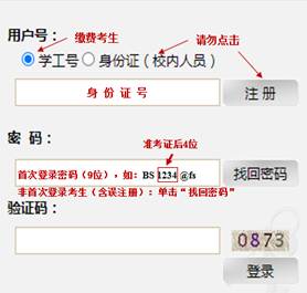 网上缴费平台”,完成缴费。考生账号已开通,切勿自行注册。收费标准:80元/生(仅申请考核考生,硕博连读考生无须缴费)。用户号在“学工号”输入正确的身份证号,初始密码(9位):“BS”+准考证编号后4位+“@fs”(准考证查看网址://yzgmis.91sqw.net/zsgl/bswb/login.aspx),如“BS1234@fs”。非首次登录缴费系统的考生(含往年报考考生及误注册考生)请使用“找回密码”,登录并缴费。