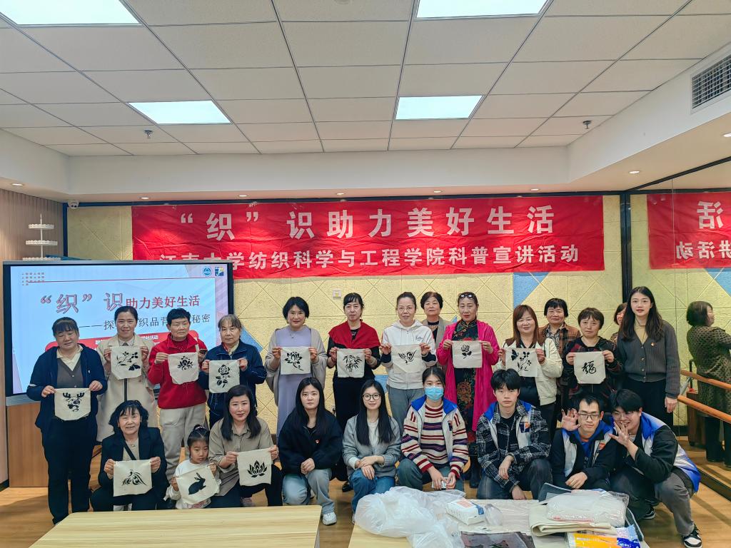 主讲人季巧从日常衣物的面料选择、洗护应知、存放指南、实用妙招等四个方面揭示纺织服装背后的科学知识。在讲解到不同衣物的洗涤标签时,老人们与主讲人进行了深入互动交流。提问环节老人们也纷纷交流自己的疑惑,主讲人进行了细致的解答。科普环节结束后,支部党员与老人们共同体验丝网印花特色活动,老人们选择喜欢的图案创造出精美的作品,体会纺织的艺术魅力。