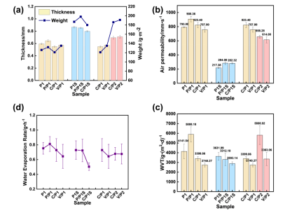 图2 (a)样品的厚度和重量。(b)样品的透气性。(c)样品的透湿性。(d)样品的水分蒸发速率。